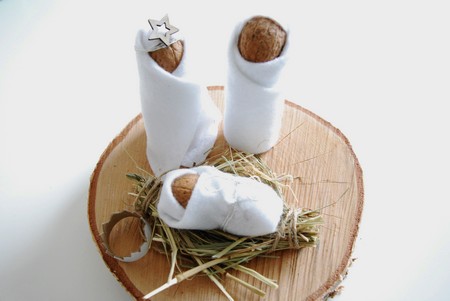 Syn ve školce vyráběl malý betlém z papíru. Nás to inspirovalo a jeden jsem si doma také vytvořili. Použili jsme úzkou ruličku z papíru a nahoru jsme připevnili tavnou pistolkou ořech. Takto připravené panáčky jsme zabalili do bílého filcu.