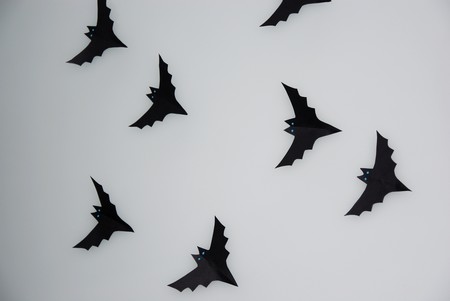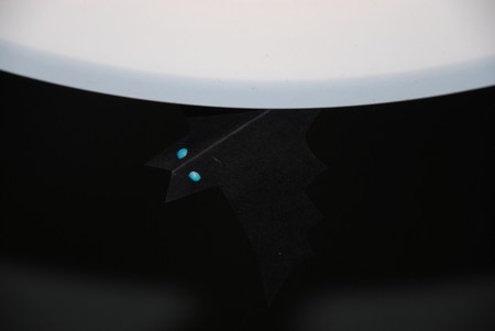 Z černého papíru jsme si vystřihli několik netopýrů a udělali jsme si výzdobu na Helloween. Netopýři se nám usadili skoro všude - na zeď, svícen nebo třeba na lampu. Na oči jsme použili barvu, která svítí ve tmě.
