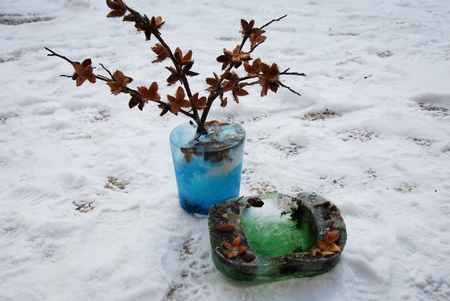 Do nádoby jsme naskládali věci, které jsme chtěli zamrazit, zalili jsme je vodou (pro obarvení jsme použili potravinářské barvivo) a čekali, až nám voda zmrzne. Pak stačí vyklopit a výzdoba je hotová.