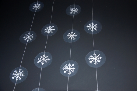 Na fólii jsme nakreslili fixem nebo svítícími barvami na sklo sněhové vločky, kolečka s vločkami jsme pak upevnili na nit a zavěsili na okno.