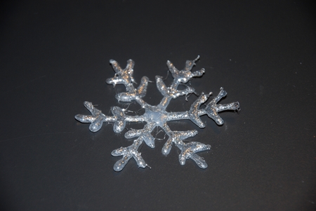 Na papír jsme si nakreslili vločku, pak jsme na něho položili průsvitný pečící papír a pomocí tavné pistole jsme vločku obkreslili. Po zaschnutí jde vločka z pečícího papíru odlepit. Ozdobili jsme ji třpytkami.