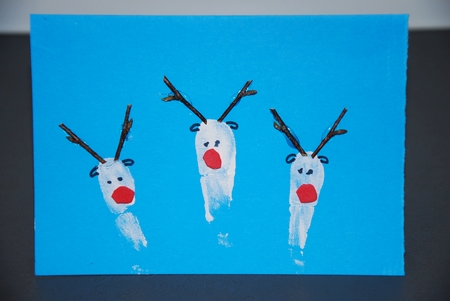Tady je několik typů na vánoční přání. Potřebovali jsme prstové barvy, moosgummu, knoflíky, větvičky, stužku, fix, lepidlo a tavnou pistolku.